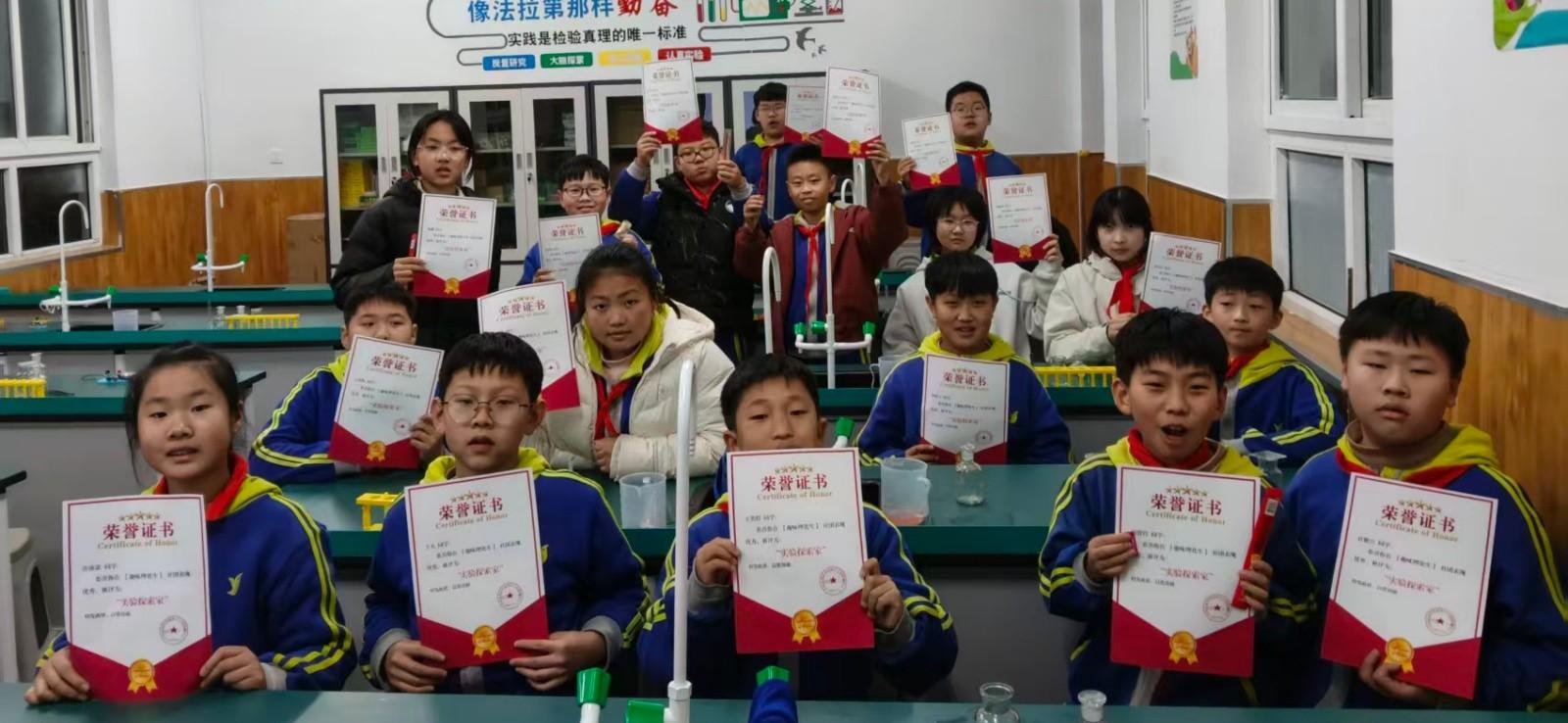 紧接着,安阳市第一实验小学四个校区的奖状合影尽显少年风采。镜头下,同学们身着整洁校服,手持奖状整齐列队,眼神中满是自信与骄傲。在趣味物化生课堂上,他们勇于尝试新奇实验,敢于提出独特疑问,在动手实践中解锁科学原理,用严谨与热忱攻克一个又一个科学小难题。这张奖状,是对他们探索精神的肯定,更是对未来继续深耕科学的激励。